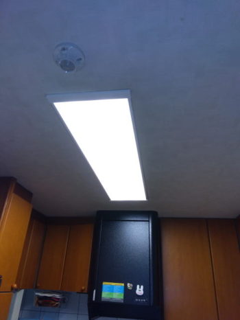 最初は奈良市のS様邸、以前にリフォームのご依頼をいただいた天井埋め込みの照明器具が古くなったので、LED式のシーリングライトにお取替えさせていただきました。