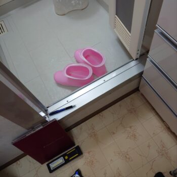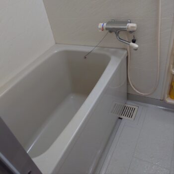 浴槽出入りの跨ぎ高の緩和と少しでも浴室を広くしたいとの依頼です。