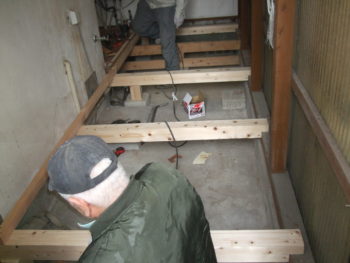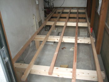 ヤード内、土間仕上げの部分の所に床を拡張します。既設の床と高さが合うように墨だしして大引きを仕込みます。その上に根太をころがしていきます。