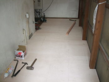 出入り口のところには、くつ脱ぎ場のため切り込みをいれました。仕上げはクッションフロアーを貼る予定です。