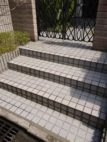 階段タイルの角(段鼻タイル)が外れたり、割れたりしていました。タイル62枚交換しました。