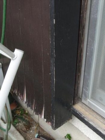 合板でつくられた鏡板が雨等で湿気にやられてボコボコ。他の鏡板も裾の所から、めくりかえってて塗装不可。雨戸本体も同じ状況でした。