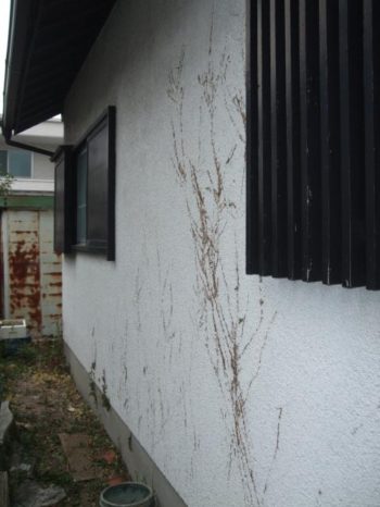 西面の壁には、蔦がはっておりました。この蔦がやっかいもので、手ではなかなか取れないので、バーナーで焼いてアク止めしてから作業すすめないといけません。それとクラック有り。