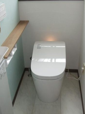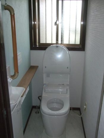 手洗い器、カウンター、手摺り、便器を取り付けて完成です。カウンターのついた壁のクロスは、アクセントに薄いブルーの色のついたクロスを貼って仕上げました。便器はパナソニック アラウーノ L150シリーズXCH1500WSN です。手洗い器は、パナソニック コンパクトタイプGHA7FC2SSSK.