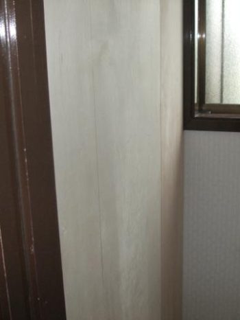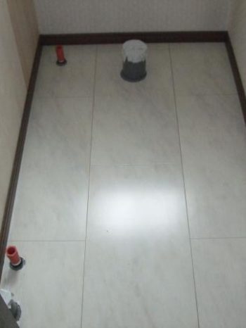 既設の便器・手洗い器を撤去して、手洗い器用の給水管・排水管を、新しく設置する手洗い器の指定の位置に移設します。移設後、新しい床材を増し張りしてしあげます。床材の色・柄が新旧似ててわかりにくいですね・・・・・