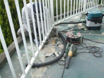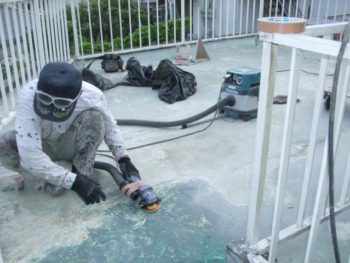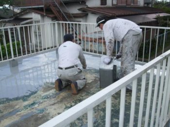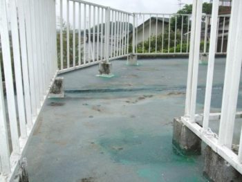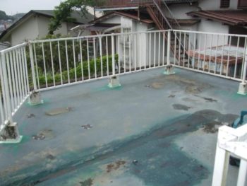 古い防水の塗膜は、切れたり穴が開いたり、もう完全に寿命がきており雨漏れしてもおかしくない状態でした。