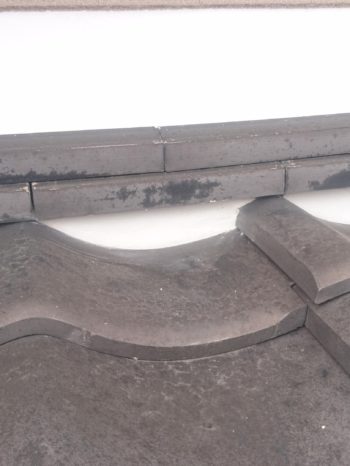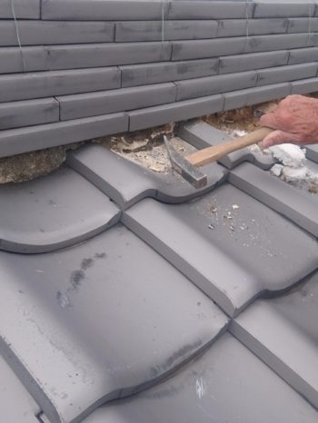 既存面戸漆喰を撤去します。 瓦が割れないよう慎重にめくります。
