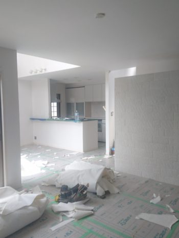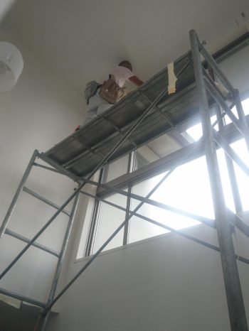 広い吹き抜けは内部足場を組み立てして 壁紙を張替しております。