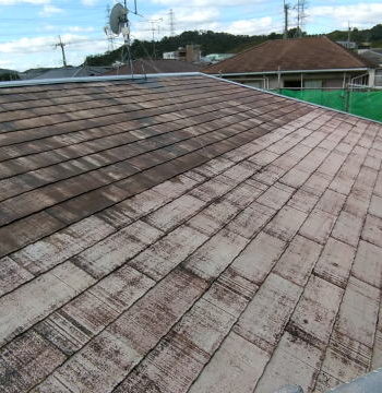 屋根の表面の仕上材も、長年の劣化で流れ落ちて白くなっています。