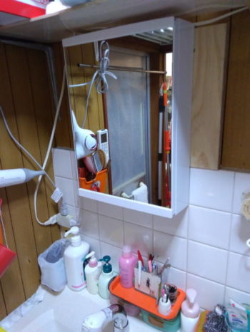 先日玄関扉を取替させていただいた生駒市のK様よりは、洗面ミラーキャビネットが痛んだので取り替えてほしいとのご依頼2件を処理させていただきました。