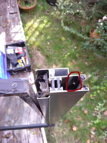 M様邸、枠止めビスが折れて立て枠が外れています。