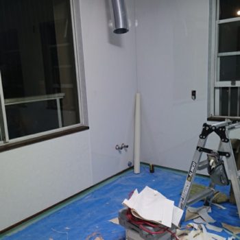 | ミニキッチンと手洗いの給水、給湯、排水工事 外壁貫通配管です。左上がキッチン換気扇フードです。⇒ |