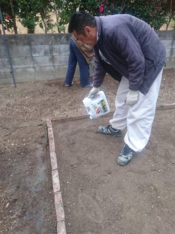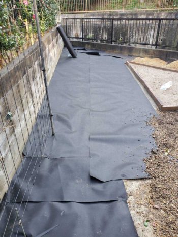 除草剤を撒いてから防草シートを張ります。