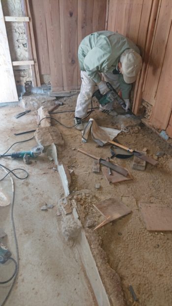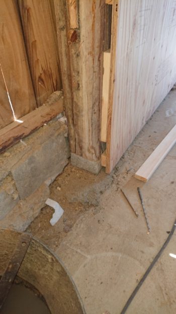 柱の腐っている所の石基礎部の削り込み中↑ |