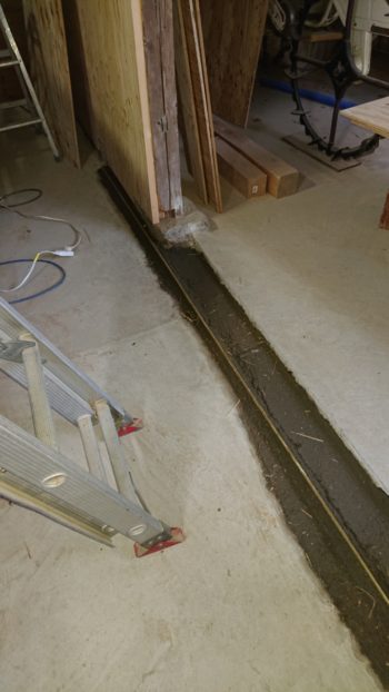 入口引き分け戸の段差解消での真鍮レール埋め込み。 |
