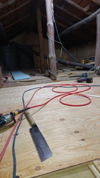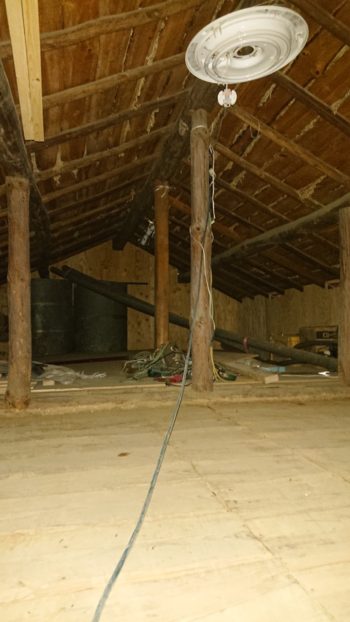 | 小屋裏つし部の壁、床の合板張りです。↓↑ | ||