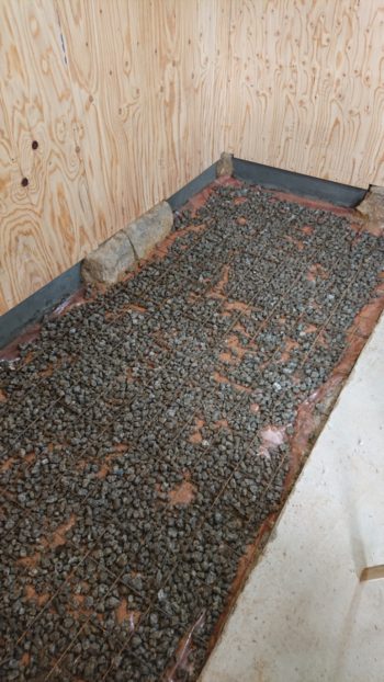以前の米置き場の土間コンクリート下地。防湿シート敷きにて湿気の防止です。