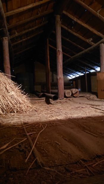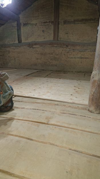 | 小屋裏つし部 わらと土の撤去後 床が見えました。 約14坪面積 土出しに3日かかりました。 土、わらのホコリがすごく 鼻の穴が真っ黒けです マスクの効き目無しでした。 |