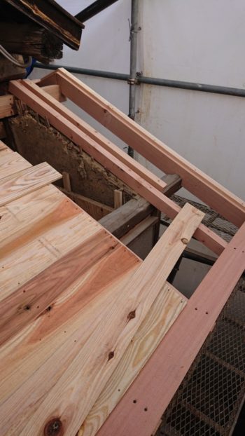 屋根瓦空葺き下地の杉と檜板の張替えの完了です。