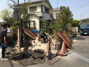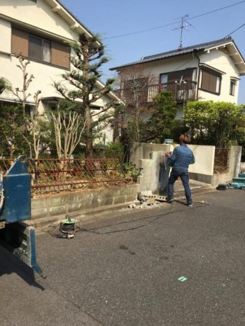 鉄のフェンスと塀のブロックを解体してます。