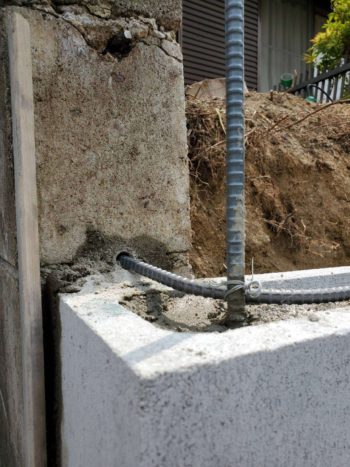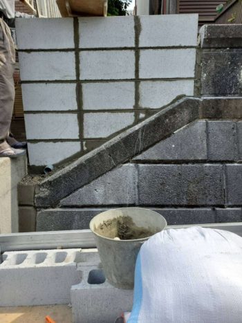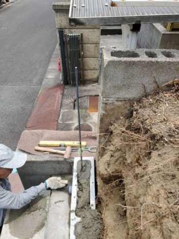 鉄筋補強工事をしてブロックを順番に積上げて行きます。