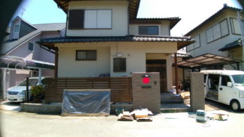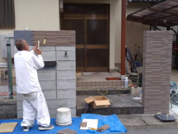 アカメモチの生垣と化粧ブロックの外構を、木目調アルミフェンスと門扉に取替えられ、門扉両側のブロックもボーダータイル張りにされました。