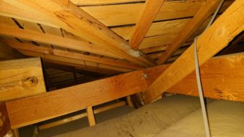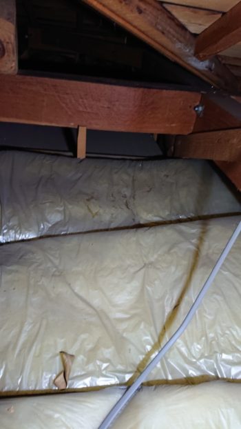| ↓大屋根の谷樋下の屋根下地垂木部分に雨漏れのしみ後です。 | ↑大屋根下の谷樋部の天井部より雨漏れ後 ↓天井裏 断熱材に雨の溜まりのしみです。 |