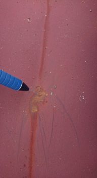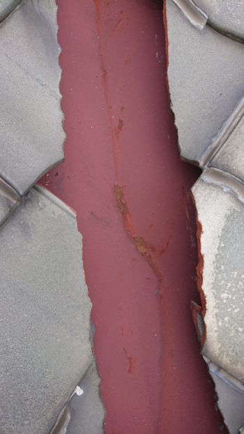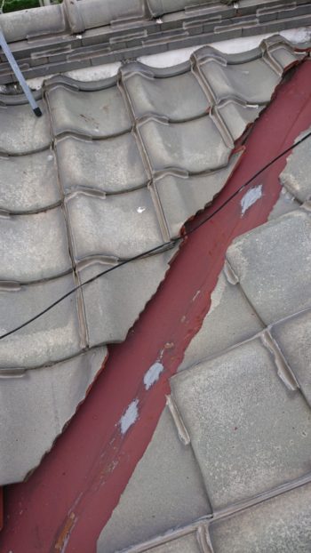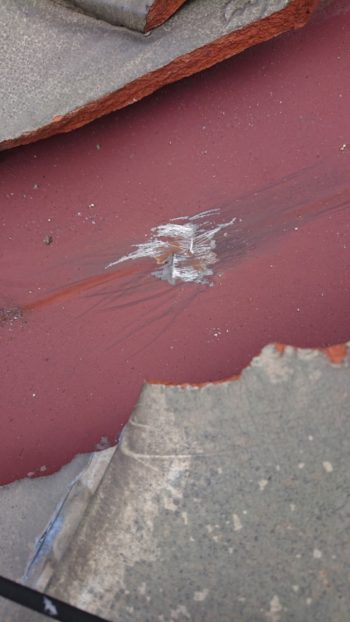 | よこに光っている所が割れ部分です。 | ↑わずかな谷樋カラー鉄板の割れからの雨漏れです。 | |