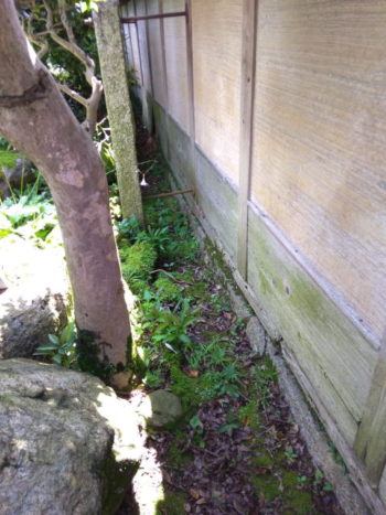 雨樋の修理のご依頼をいただきましたOB施主様の天理市Y様邸、お母様が先日お庭廻りをお掃除されていて気が付かれたのですが、古い趣のある塀の内外の木部が、腐食等で痛んできました。