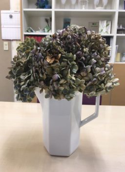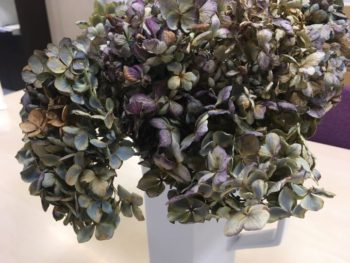 以前ご紹介した会社のあじさい。時期を過ぎ立ち枯れていました。その姿があまりに淋しいかったので、切り揃えてドライフラワーにしました。