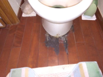 少し前にお好きな山登りに数日お出掛けになり帰宅をされると、トイレの便器から水漏れをしており、床板が写真のように腐食していたとのことでした。