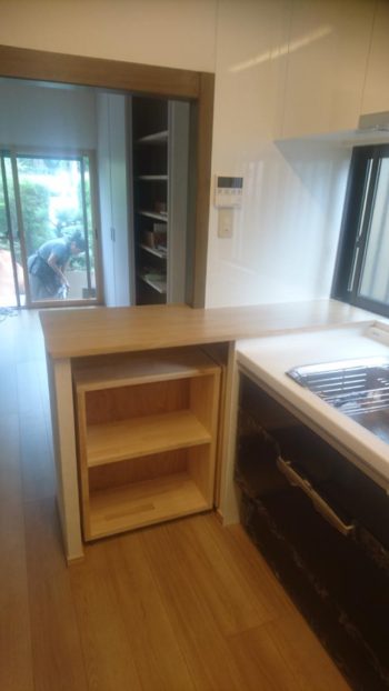 キッチン対面カウンター下収納・普段あまり使用しない家電を奥のスペースにキャスター付