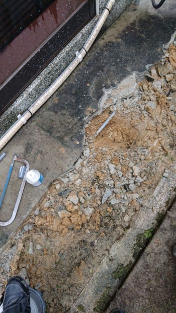 | 土間ハツリ 浅い位置での給水配管 危ないところでした。 | 粘土質とコンクリートと桝からの漏れでジュクジュク状態です。 | |