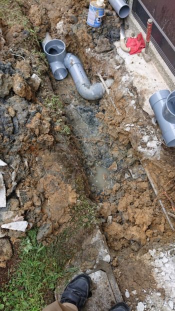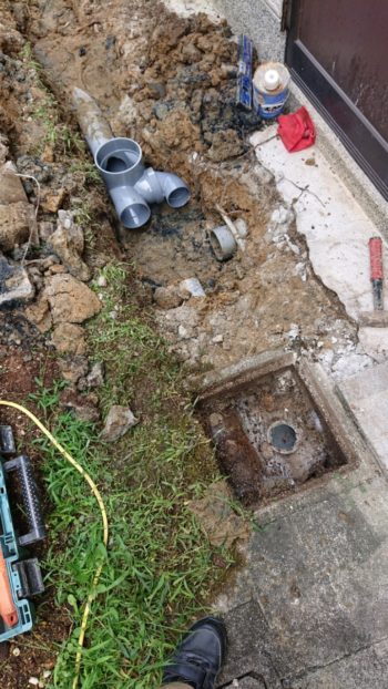 | 既設の排水管の位置が高くつなぎこみ難航です。 | ||