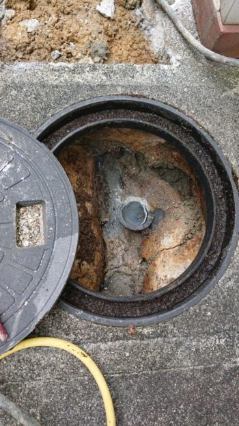 奈良県三郷町のI様邸 生活排水が木の根っこにて詰りによる コンクリート製排水桝から塩ビ製の排水桝に取替えを行いました。