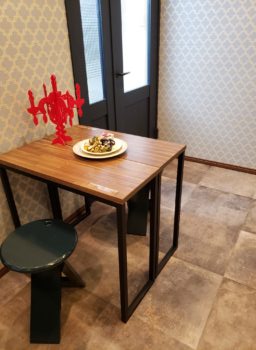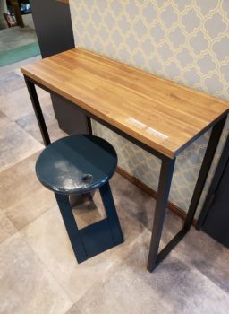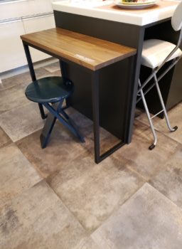 新しい店舗ショールーム用として小さいテーブルを作りました。天板はパナソニックのインテリアカウンターをサイズW750×D300×厚24に2枚オーダーして+脚はアイアン作家さんに作ってもらいました。
