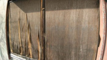 木製雨戸の合板が、長年の劣化により表面の単板が剥がれてきました。