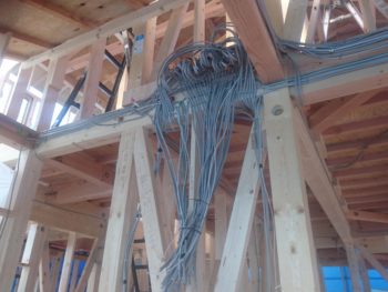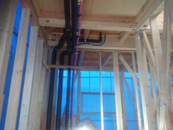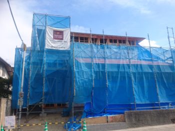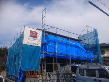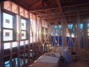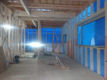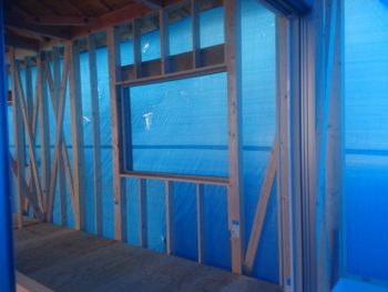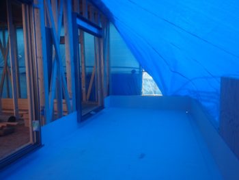 大工さん雨養生も完ぺきの中 窓サッシ取り付けに入っております。