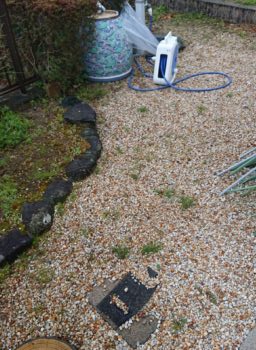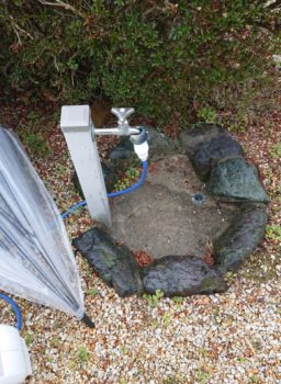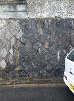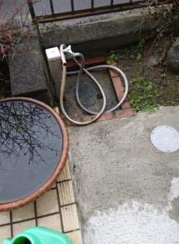 外部間知石擁壁より水漏れ跡が、おそらく外部庭にある古い立水栓の