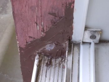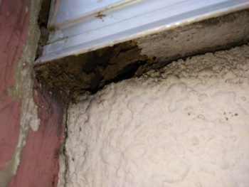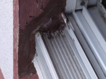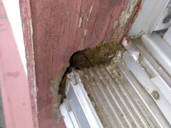外壁と雨戸の取り合い部の木部腐食と外壁欠落で、