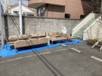 待合室の家具を外へ出して養生します。