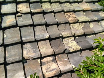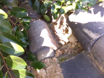 更にすぐ近くにモチノキ?大木があって屋根瓦を押しています。