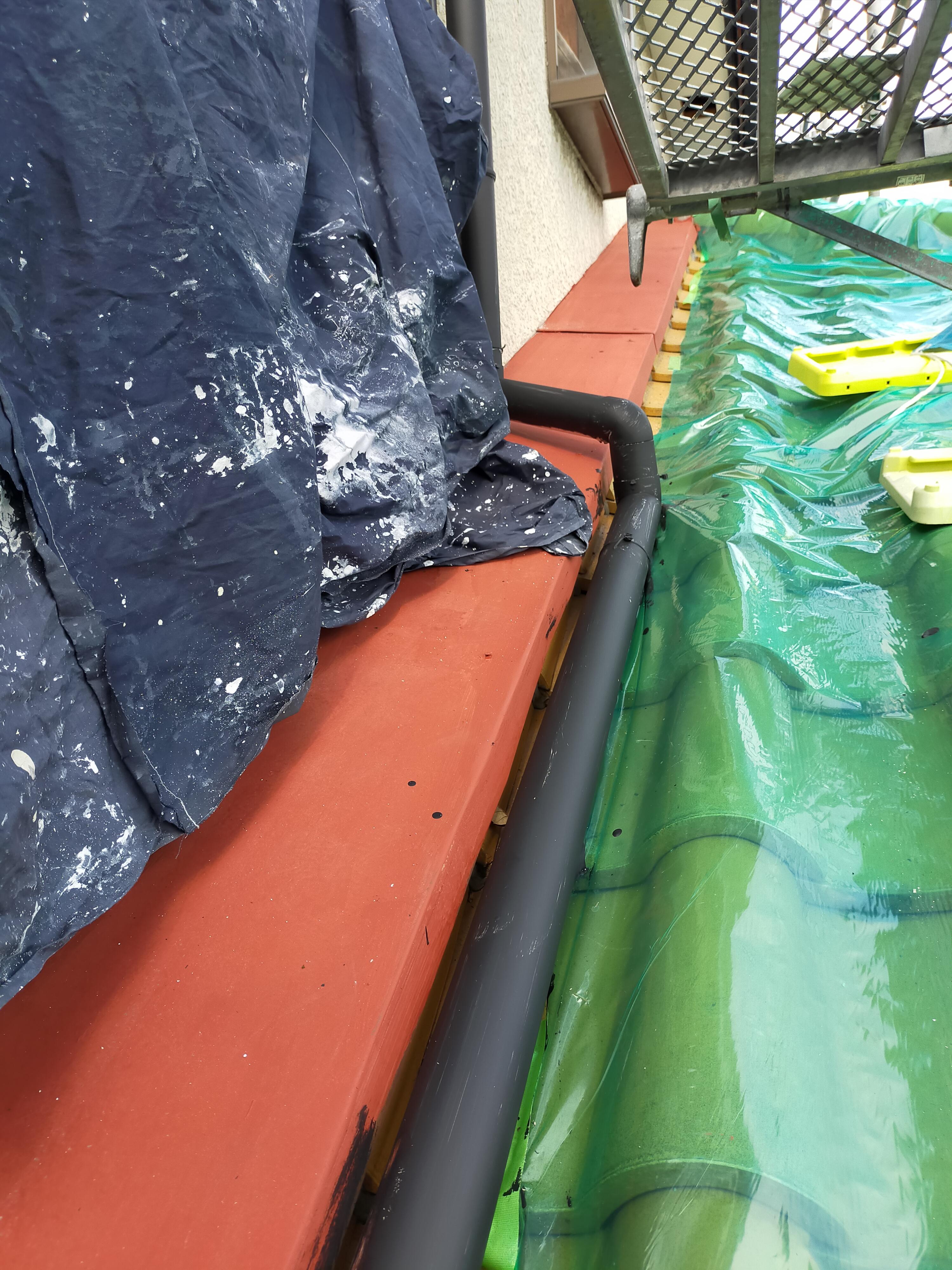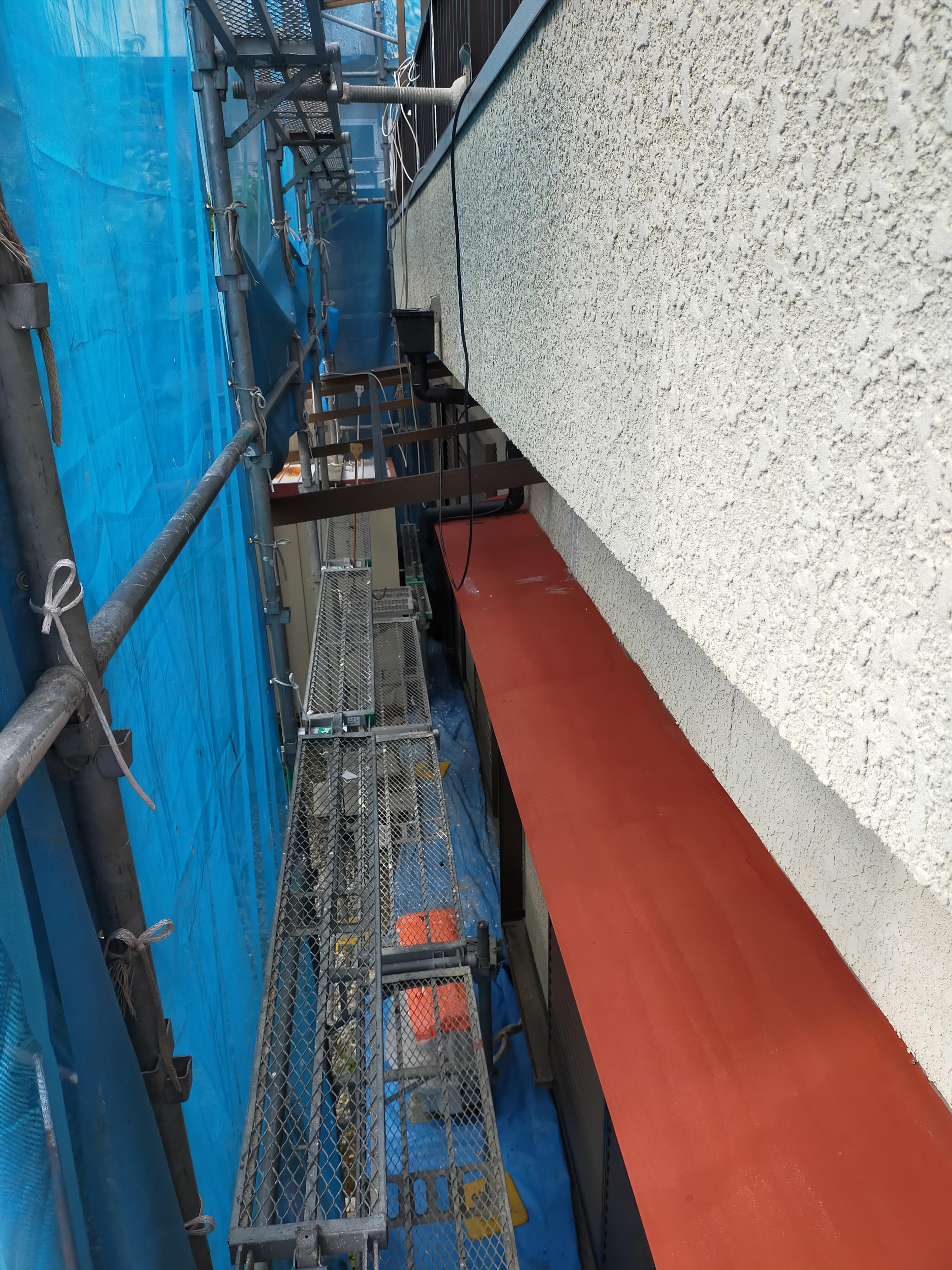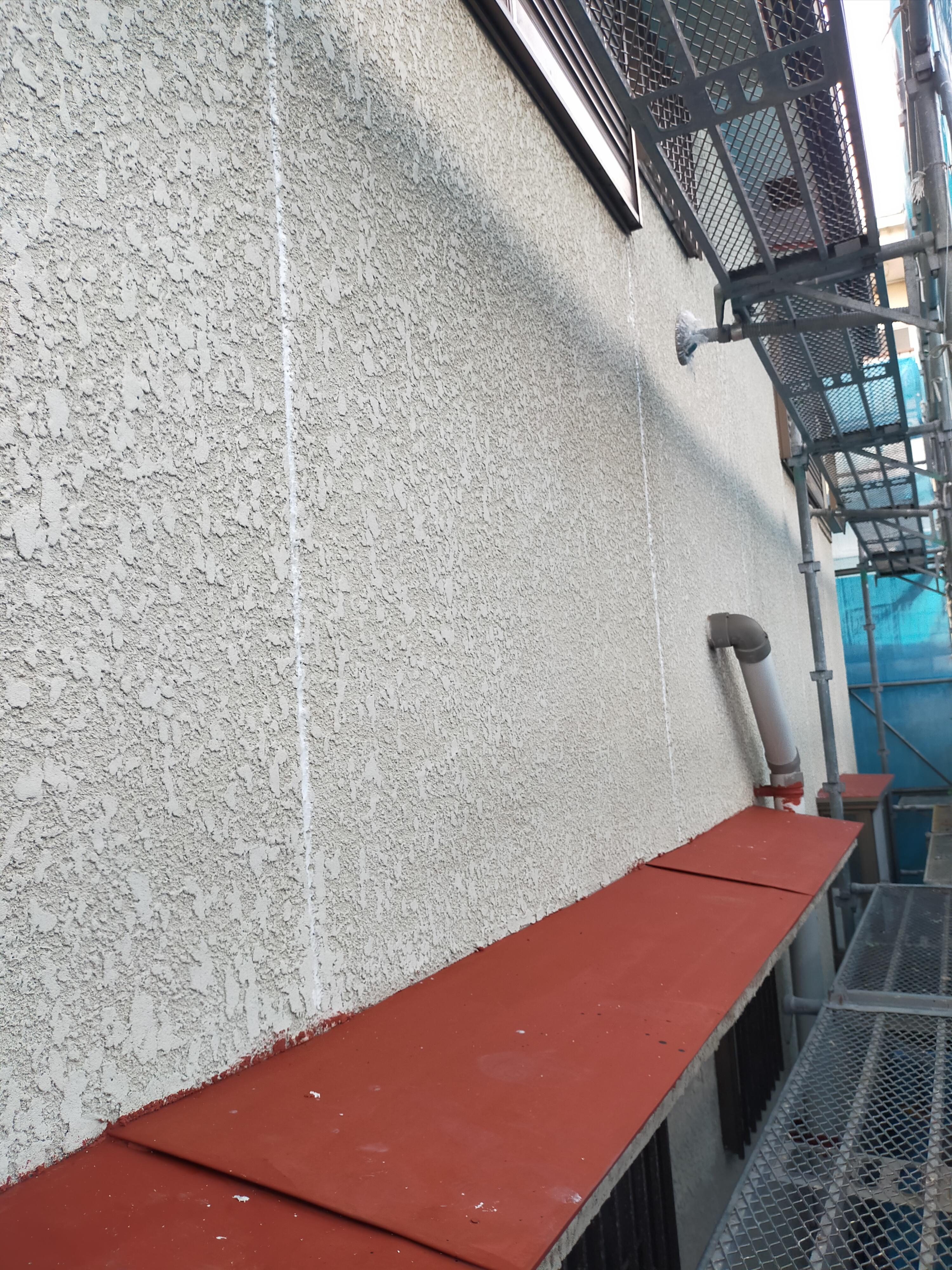 高圧洗浄(水洗い)後、クラック処理、鉄部錆止め塗りを進めています。