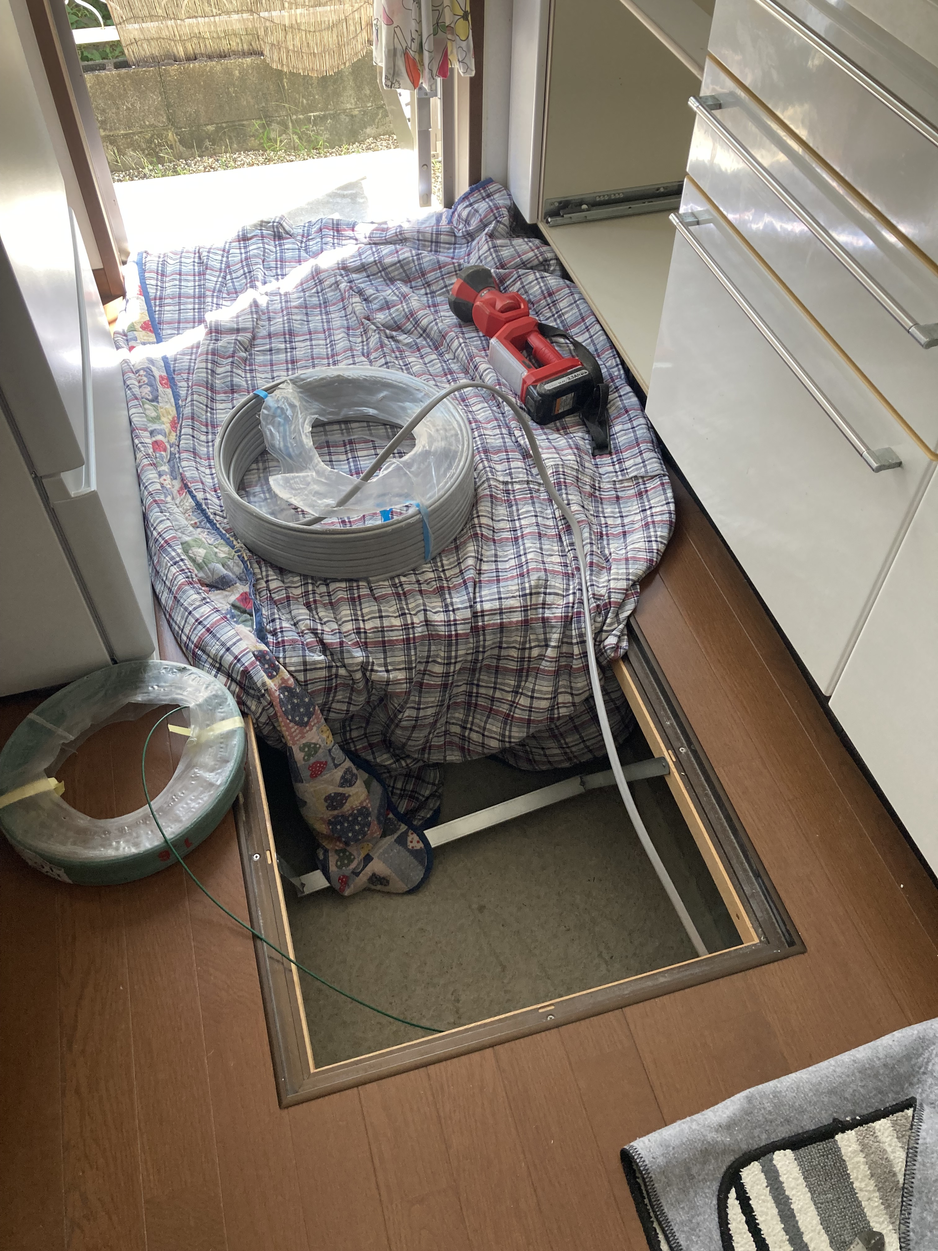 床下収納庫から潜ってIHクッキングヒーターの配線は大変でした。