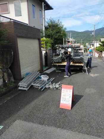 足場施工組立の時は、台風接近中で少し心配でしたが、無事組立完了です。