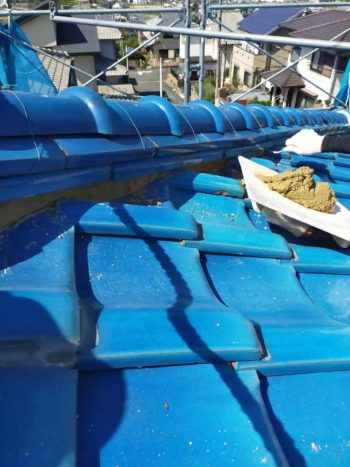 古い漆喰を捲り、土の補強作業をだけ下屋根は完了です!