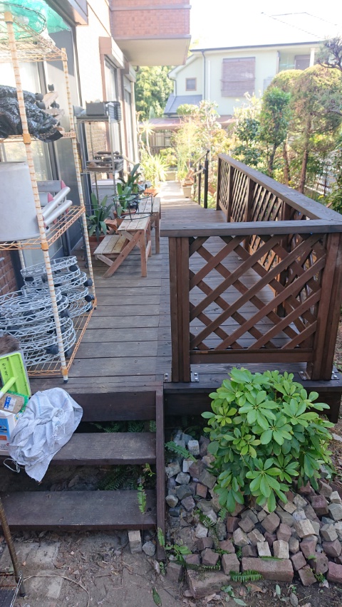 ![]() ウッドデッキ部 腐食部分の張替えを行いました。杉板材白蟻予防材、防腐剤塗りで完成です。 |