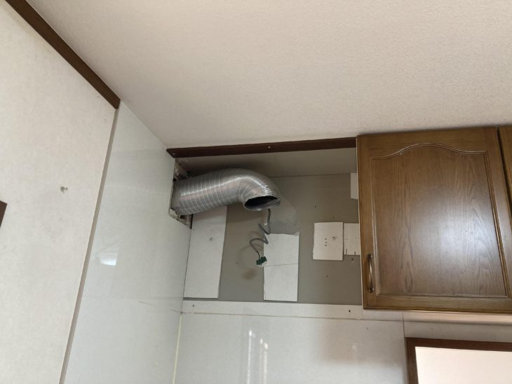 既存のレンジフードを外して新しいフードと取り替えています。