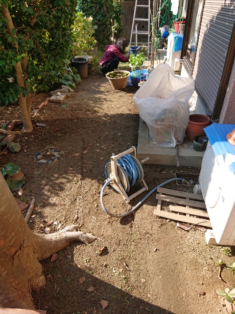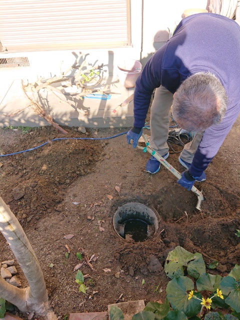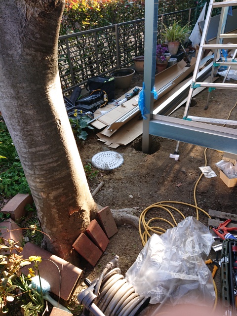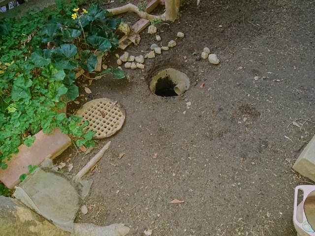 施工前の雨水桝 サンルームの柱部分に当たりますので少しの移設です。