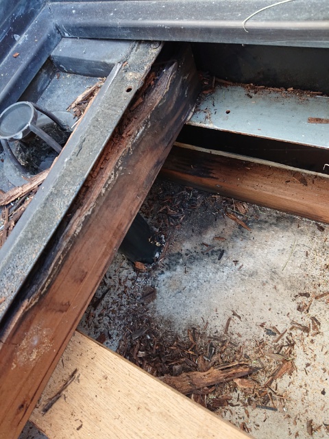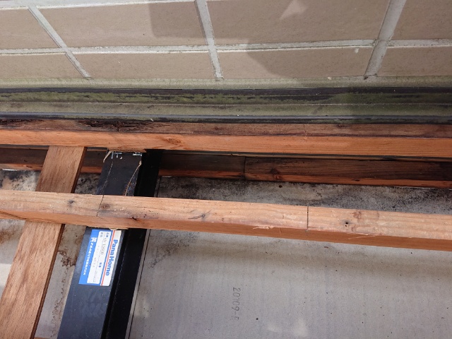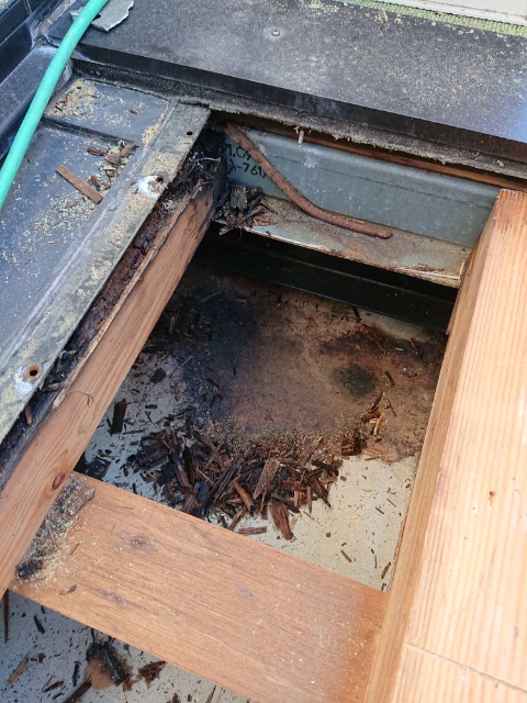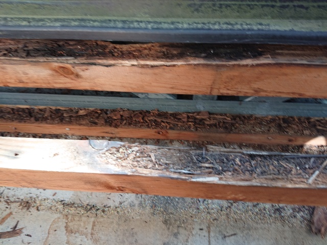 外側の手摺壁面下水切り部↓ 腐食がひどいです。下地合板との隙間が約5㎜程ありました。